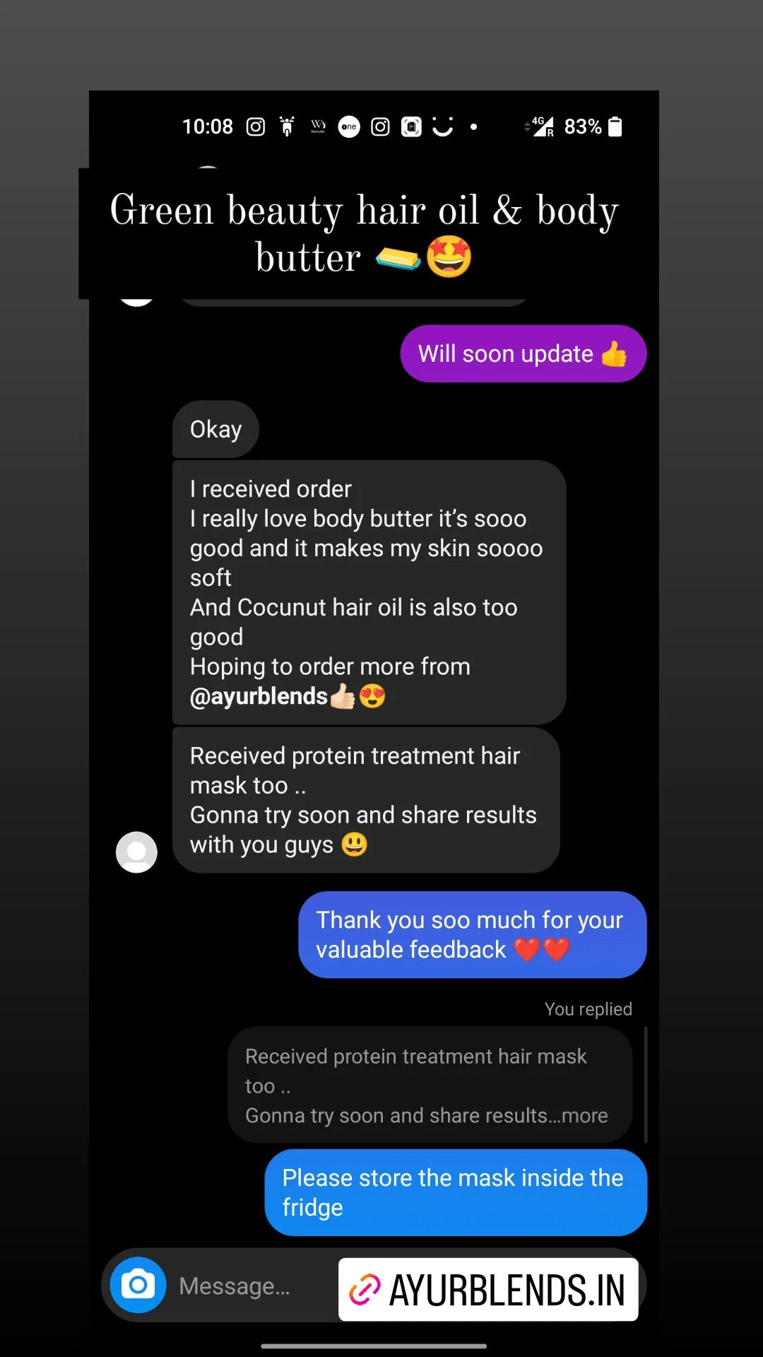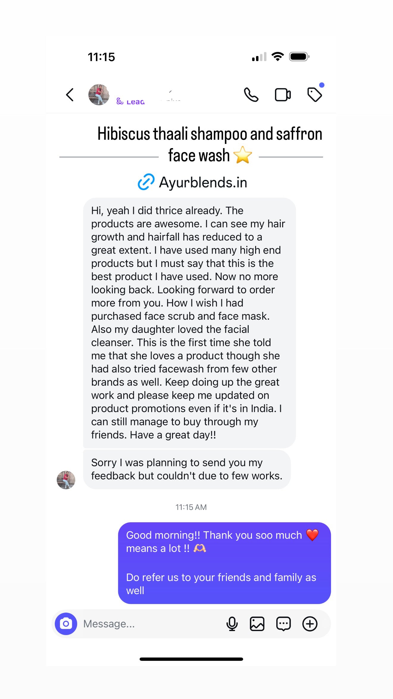 Back in 2019, our first customers were only our friends and relatives to whom we regularly distributed our products for reviews before handing them out to you so that you can love, care and pamper yourself free from all toxicity. It is with their valuable feedback and your trust that Ayur Blends has been able to improve and show the best results.