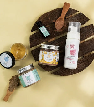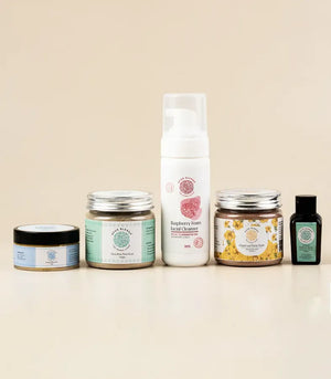 Raspberry Foam Cleanser | Sunset-Saffron Gel | Suvarna Radiance Serum | Citrus Brew Face Scrub | Clean Up Face Mask