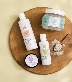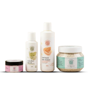 The Ayur Blends Healthy Hair Routine is a restorative and strengthening combo our Vantablack Hair Oil, Protein Treatment Hair Mask, Fruit Punch Hair Cleanser and Leave In Conditioner that brings together the natural goodness of green tea, lemon, papaya and more which not only leaves your hair smelling good but also keeps your scalp healthy, improving overall hair texture and promoting healthy hair growth.