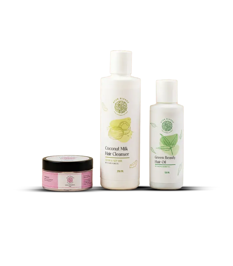 The Ayur Blends Junior Hair Care Routine offers your child kid-friendly safe care that comes with our Green Beauty Oil, Coconut Milk Hair Cleanser and Leave In Conditioner. Containing natural ingredients like coconut milk, aloe vera, virgin coconut oil and more, this hair care routine helps in moisturising dry hair and strengthening the hair follicles to control hair fall and maintain the natural shine of your baby’s hair.