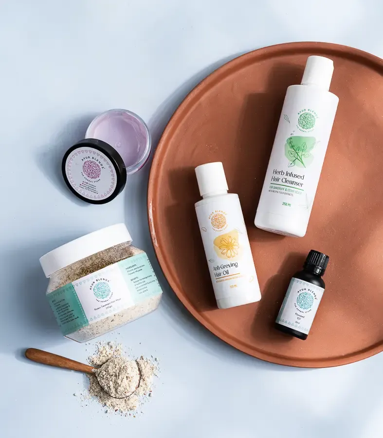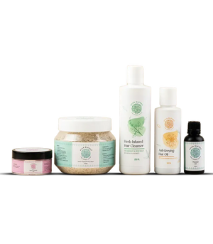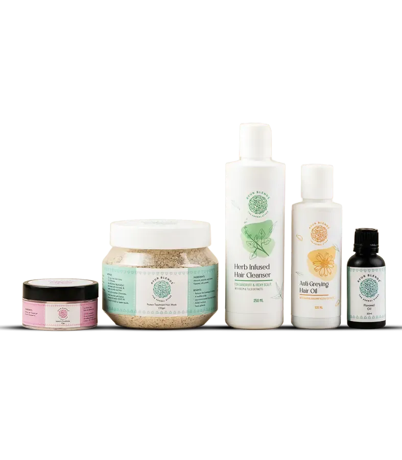 Hello Mother! We understand that your hair needs damage control to strengthen hair follicles and restore a healthy hair growth after giving birth. The Ayur Blends Postpartum Hair Kit is the healthy hair diet for you containing the deep-rooted care of our Anti-Greying Hair Oil, Protein Treatment Hair Mask, Herb, Infused Hair Cleanser, Leave In Conditioner and Flaxseed Oil that arrests hair fall, treats split ends and reduces hair breakage to boost hair volume.